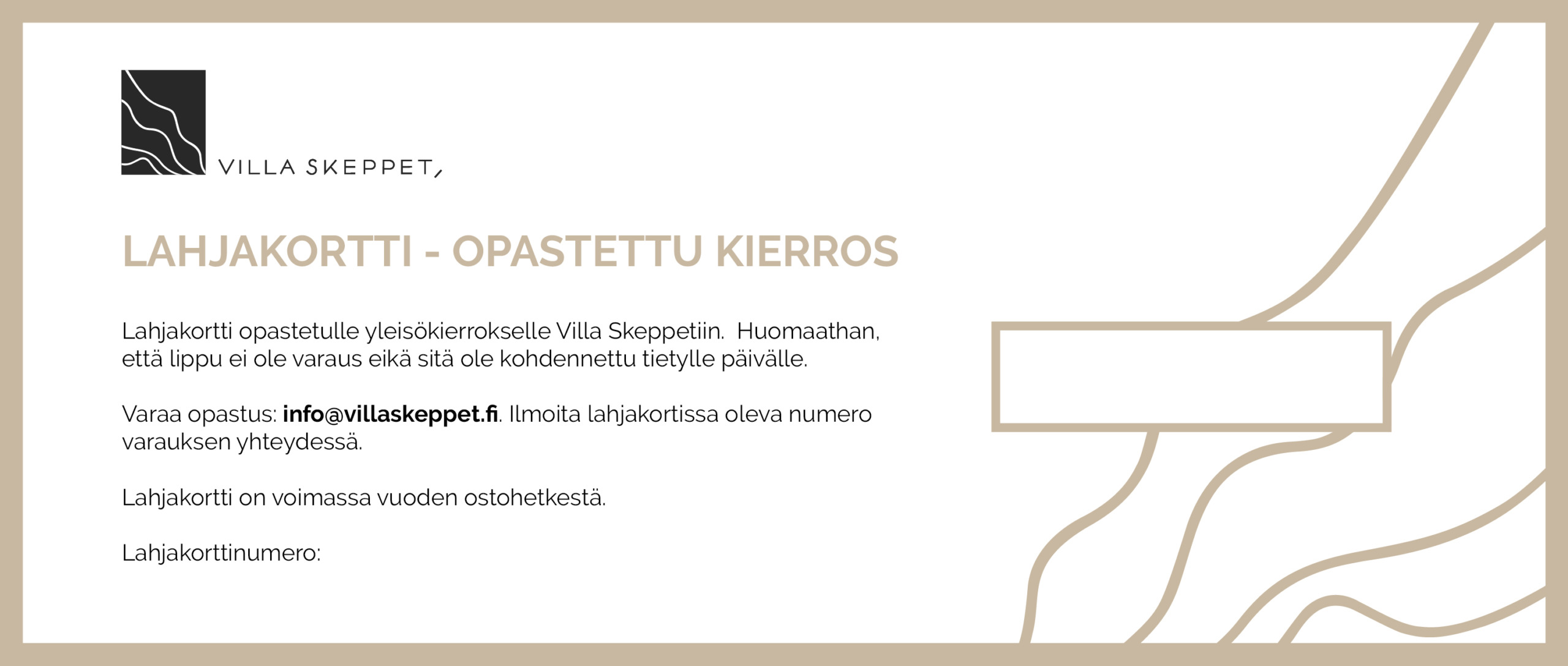 Lahjakortti opastetulle yleisökierrokselle Villa Skeppetiin. Ostaessasi lahjakortin voit valita henkilömäärän ja myös alennetut lippuhinnat. Lahjakortti maksetaan heti ja toimitetaan sähköpostitse tilaajan sähköpostiosoitteeseen. Huomaathan, että lippu ei ole varaus eikä sitä ole kohdennettu tietylle päivälle.